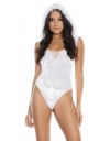 Baršunasti body sa dekorativnim podesivim vezicama između grudi koji završavaju pomponima. Na stražnjem djelu krznena kapuljača sa porubom od umjetnog bijelog perija. Visok izrez na bokovima i otvorena guza vizualno produljuju vašu figuru.