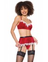 Košarice i halteri su obrubljeni bijelom čipkom. Košarice su lagano podstavljene i poduprte žicom. Naramenice su podesive po dužini. Halteri su zvonolikog oblika.