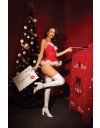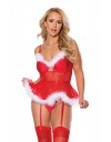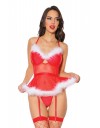 Predivan set korzeta i gaćica u trenu Vas pretvara u sexy mrazicu. Korzet od crvenog tila peplum je kroja i obrubljen je bijelim perjem. Košarice su poduprte žicama, a struk je dodatno naglašen elastičnom trakicom. Na korzet se mogu spojiti i halteri koji su podesivi po dužini i čarape. Naramenice se mogu prekrižiti na leđima i podesive su po dužini. Gaćice su također od crvenog tila.