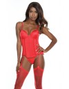 Ovaj moderan profinjeni korzet osnažen je push up košaricam, žicama i naglašenim okomitim šavovima, pa ističe obline i čuva sve na svome mjestu. Kopča se patentom sprijeda i uključuje naramenice i haltere koji se mogu skidati, pa nudi i razne mogućnosti.