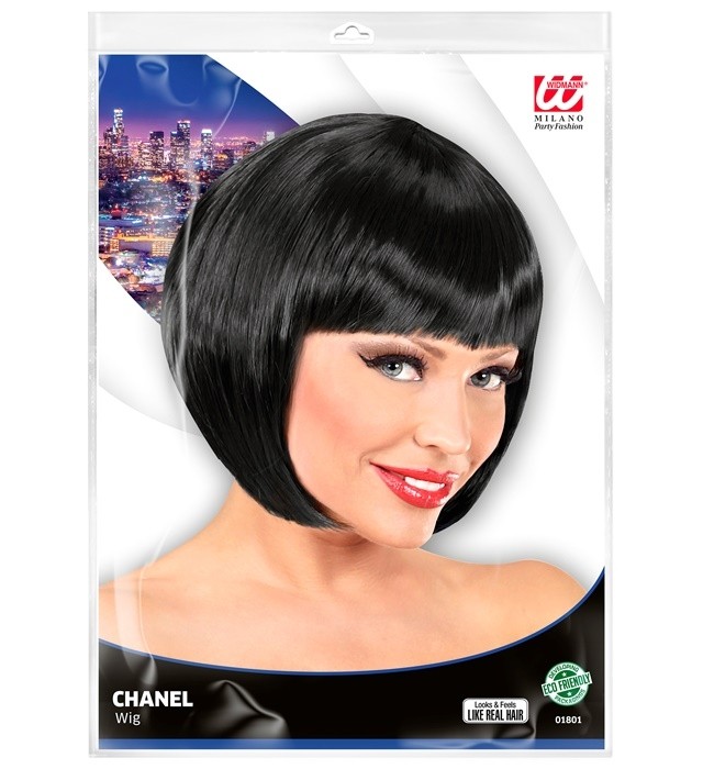 Sintetička perika oblikovana u kratki ravni bob sa šiškama.