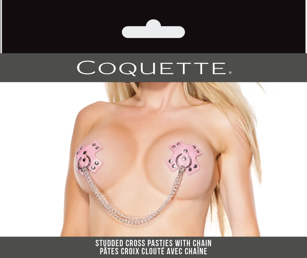 Samoljepljive roza naljepnice za grudi u obliku križa sa zakovicama ,ringom i metalnim lancem.
