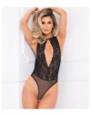 Crni čipkasti bodi sa detaljem sitnog lanca koji prolazi između grudi. Na prsima i leđima se nalazi duboki prorez..