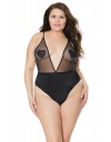 Seksi bodi s rasporkom u kombinaciji prozirnog mesh materijala i mekog elastičnog crnog tkanja. Naramenice su podesive i vežu se u križ. Preklapanje naramenica može biti namješteno na leđima ili sprijeda.