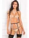 Senzualan čipkasti komplet grudnjaka, haltera i gaćica u boji pudera . Košarice su pojačane žicom i naramenice su podesive po duljini.