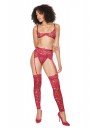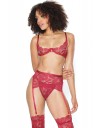 Vatreni čipkasti set koji se sastoji od grudnjaka, tangi i haltera. Grudnjak se kopča naprijed, a tangice i halteri su prilagodljive veličine.