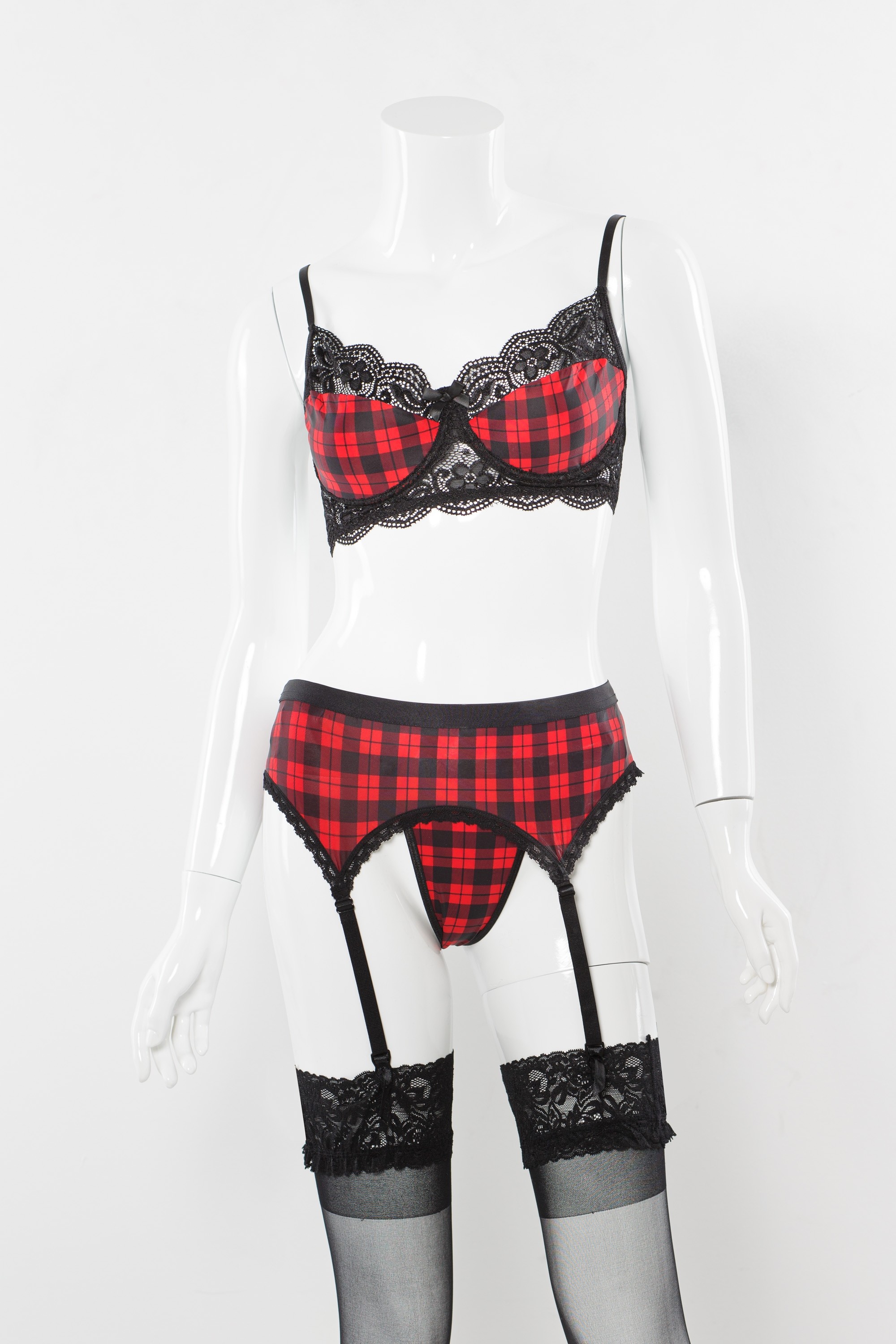 Seksi školarka ,uzbuđenje blagdanske noći ili pak uzdah škotskih visina...ovaj vrući komplet kockastog uzorka obrubljen nježnom crnom čipkom daje ti priliku da budeš svo troje i više! Komplet se sastoji od grudnjaka pojačanog žicom, haltera i gaćica. Širina gaćica i haltera kao i naramenice na grudnjaku je podesiva.