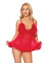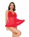 Spavaćica je od mekog crvenog tila, a košarice i porub ukrašeni su crvenim perjem. Naramenice su podesive. Uz nju dolaze i odgovarajuće tangice.