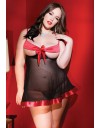 Babydoll bez košarica od crne prozirne tkanine sa crvenim satenskim obrubom pri dnu. Umjesto košarica zavodljiva crvena satenska mašna koja prekriva grudi. Naramenice su podesive. U kompletu dolaze i pripadajuće tangice.