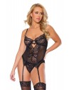 Korzet je od kombinacije crne meke čipke i rastezljivog tila. Košarice su poduprte žicom, a između njih se nalazi crni privjesak koji će dodatno naglasiti dekolte. Naramenice se mogu podesiti i prekrižiti na leđima. Halteri su podesivi po dužini. Gaćice su podesive po širini i mogu se otkopčati.