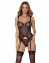Korzet je od kombinacije crnog prozirnog tila prošivenog crvenom trakicom te je obrubljen volančićima. Košarice su poduprte žicom i između grudi se nalazi detalj crvene ruže. Naramenice se mogu podesiti po dužini. Kopča se na leđima elastičnim trakicama koje daju izgled "korzet vezanja" i mogu se podesiti po širini. Halteri su podesivi po dužini. Na gaćicama se također nalazi ušivena crvena trakica i detalj ruže u sredini.