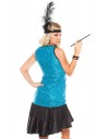 4-dijelni kostim ukjučuje: šljokičastu tirkiznu haljinu sa crnim lepršavim donjim dijelom, crni šljokičasti ukras za glavu sa zataknutim perom, dugu ogrlicu i muštiklu.