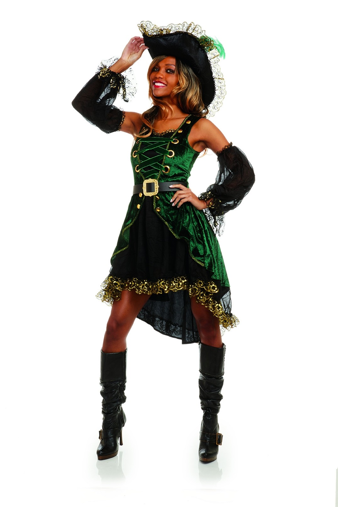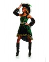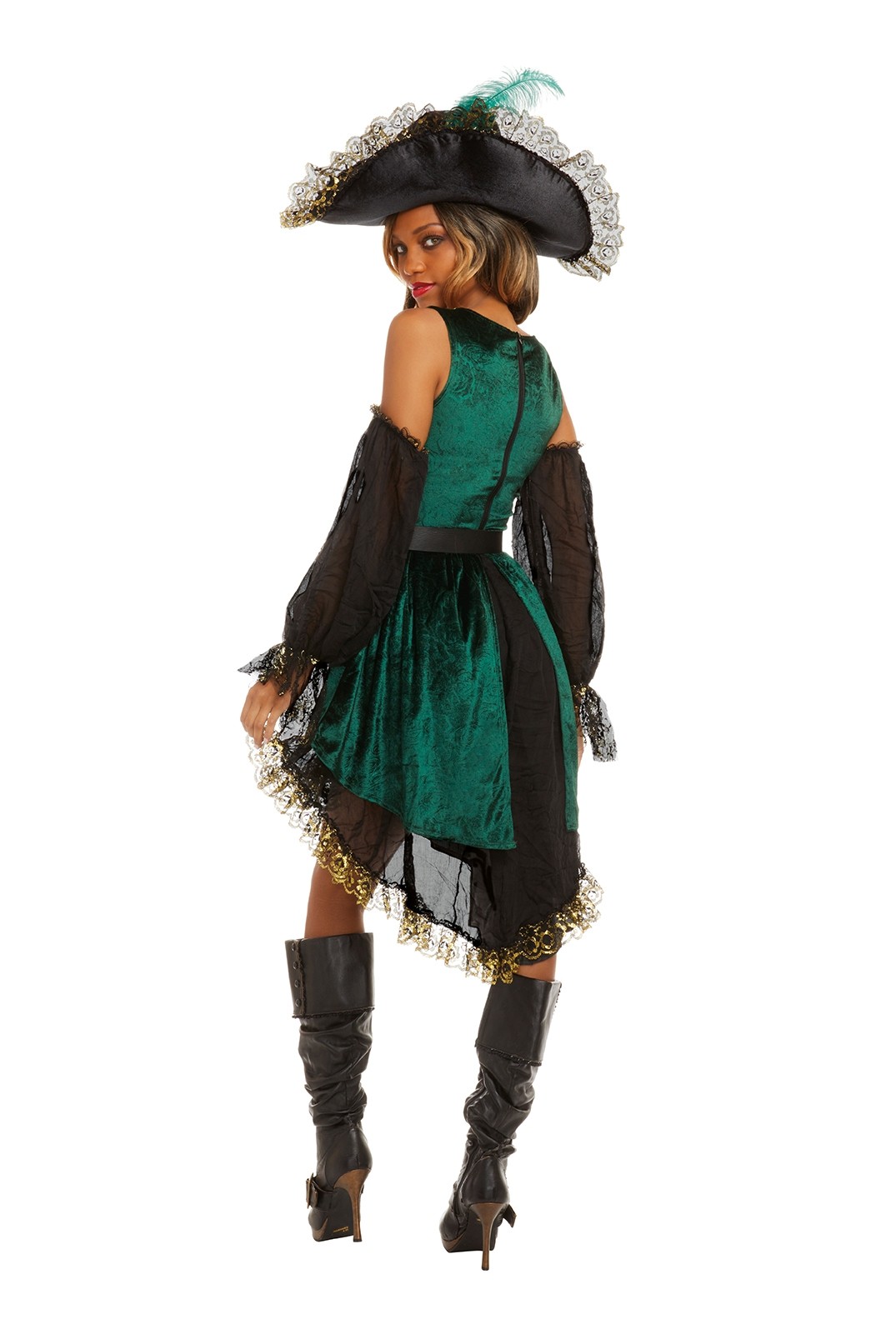 Kostim se sastoji od 4 dijela. Haljina u kombinaciji smaragdno zelenog baršuna i crnog lepršavog tila sa zlatnim obrubom. Dekolte je naglašen korzet vezanjem, a struk crnim remenom od umjetne kože sa zlatnom kopčom. Rukavi su od crnog tila i također imaju zlatni obrub. Uz kostim dolazi i odgovarajući šešir koji će savršeno upotpuniti Vaš gusarski look.