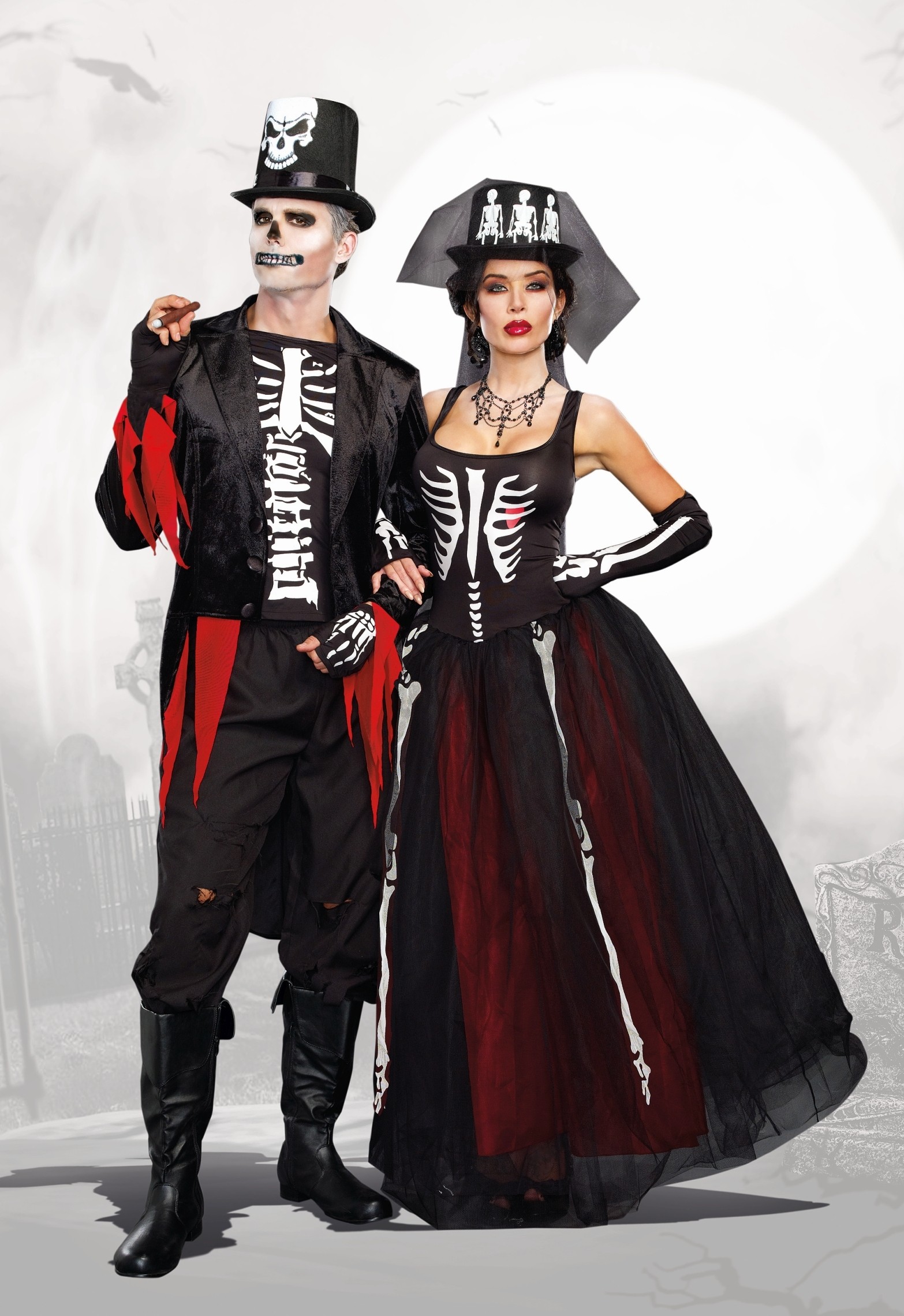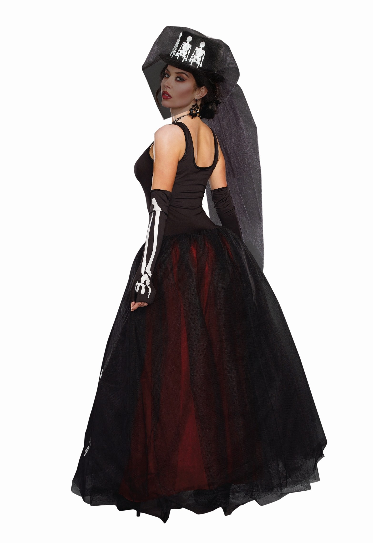 Ova haljina s motivom kostura sastoji se od gornjeg elastičnog dijela na koji se nadovezuje suknja od bogatog tila i satena. Uključuje i rukavice s motivom kostura. Nakit nije uključen, a šešir se može kupiti posebno.