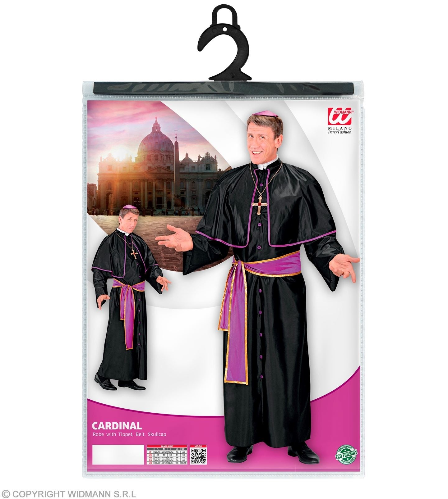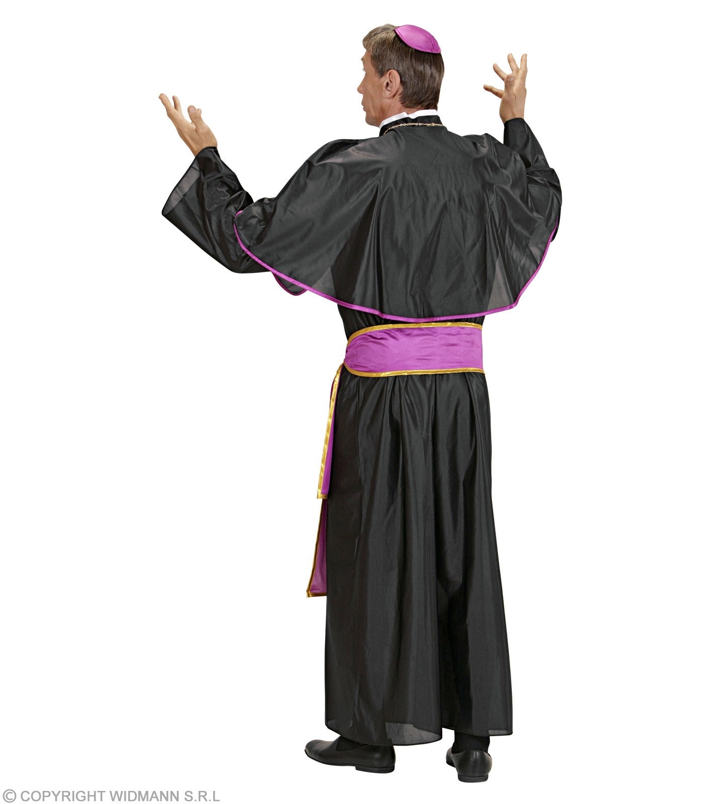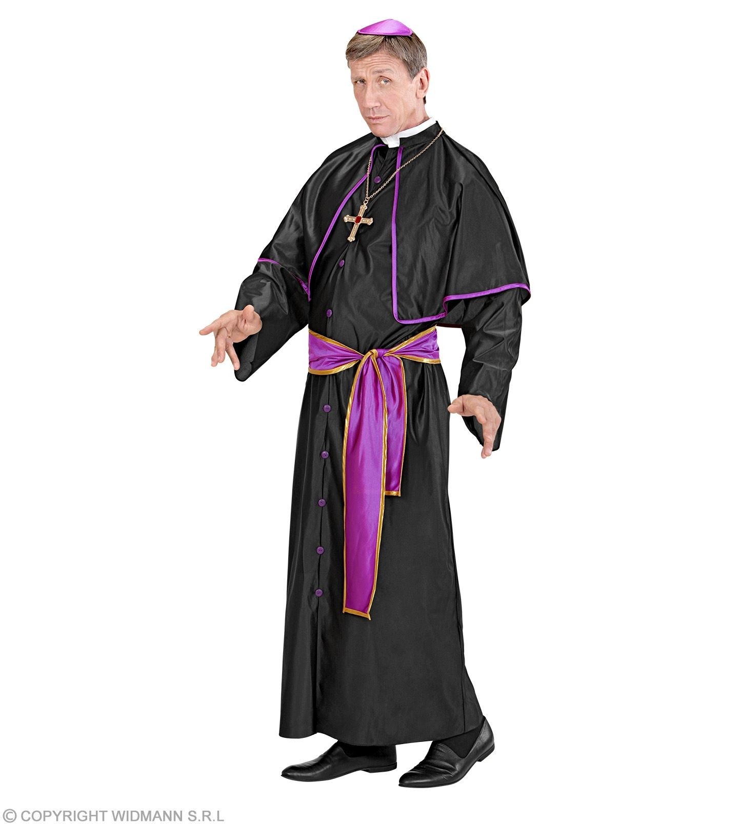 Kostim kardinala sastoji se duge crne odore sa kratkim ogrtačem, ljubičastim remenom i ljubičastom kapom.