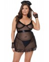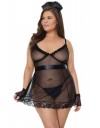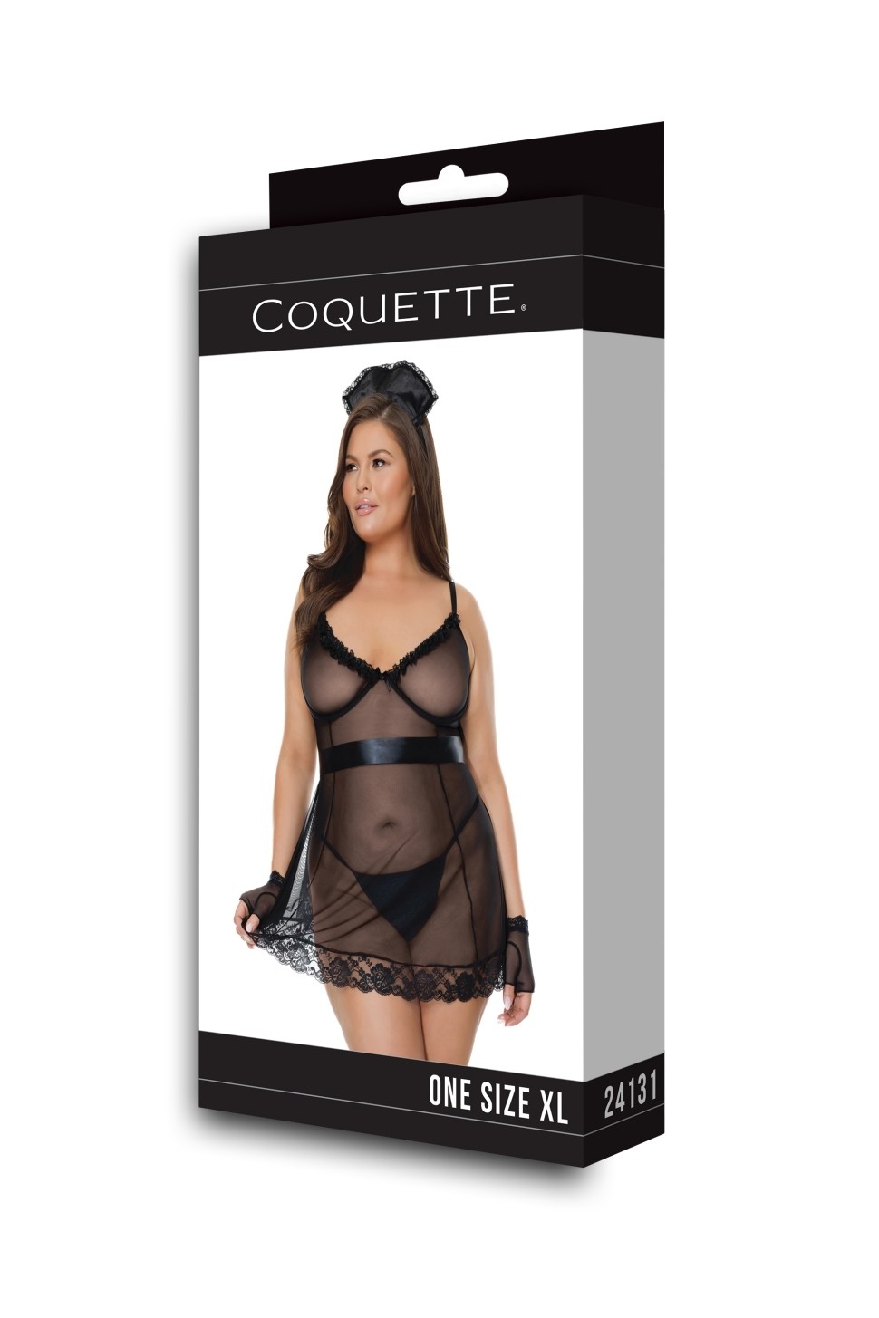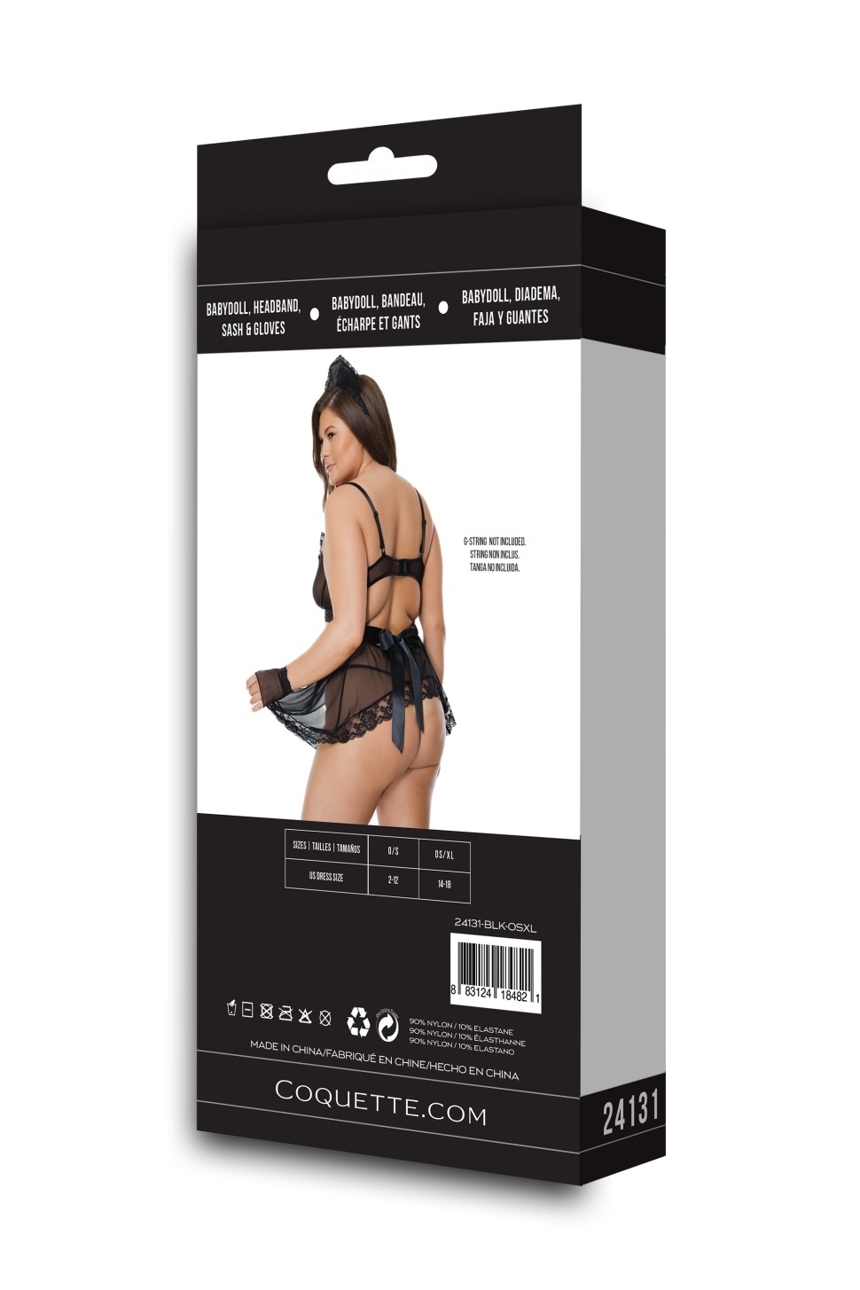 Kostim se sastoji od spavaćice, rukavica bez prstiju, podesive trake za glavu te satenske vrpce za vezanje oko struka. Traka daje detalj velike mašne na guzi. Spavaćica je od crnog rastezljivog tila otvorenih leđa sa podesivim naramenicama. Rub spavaćice čini crna čipka.