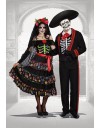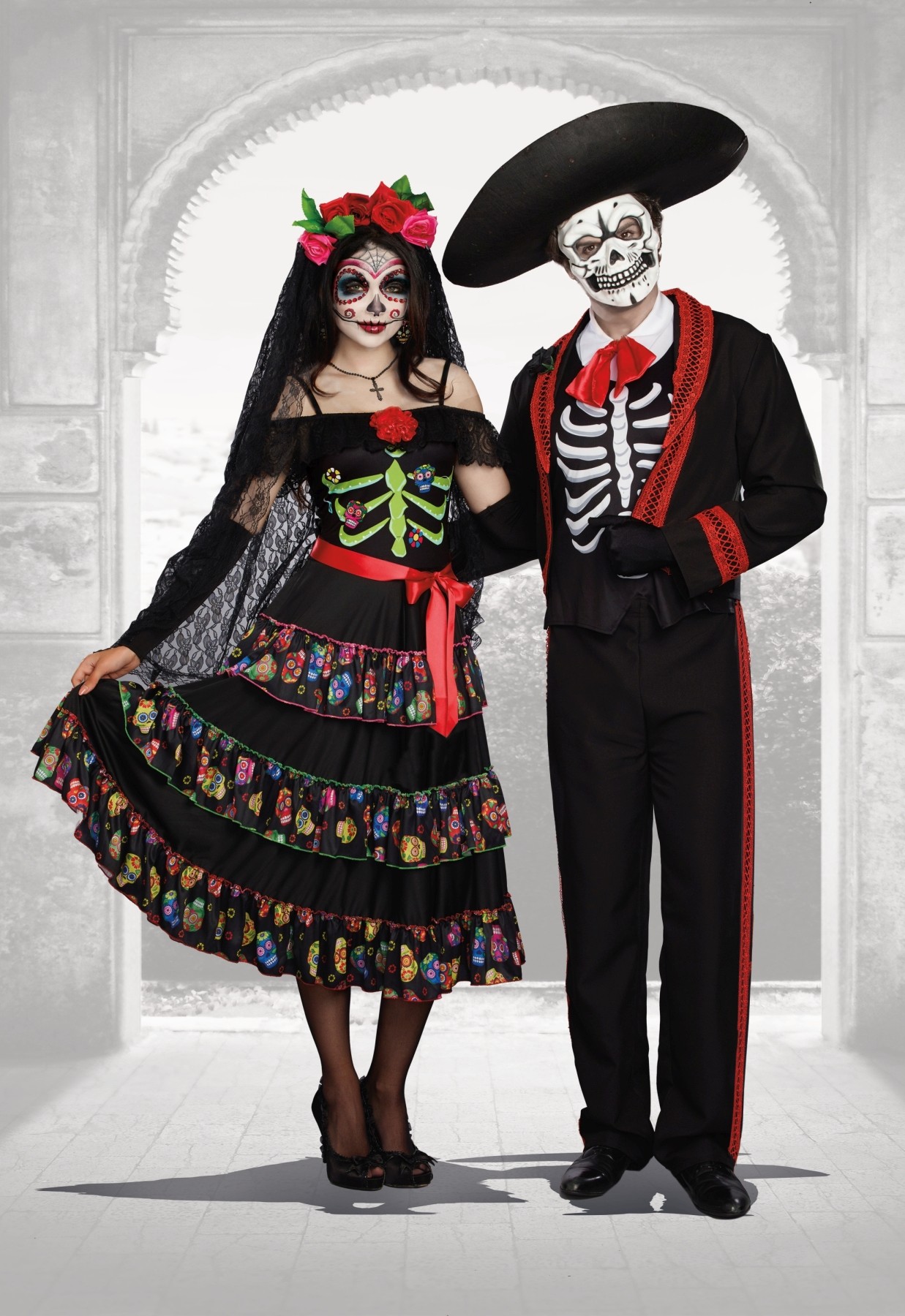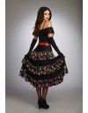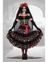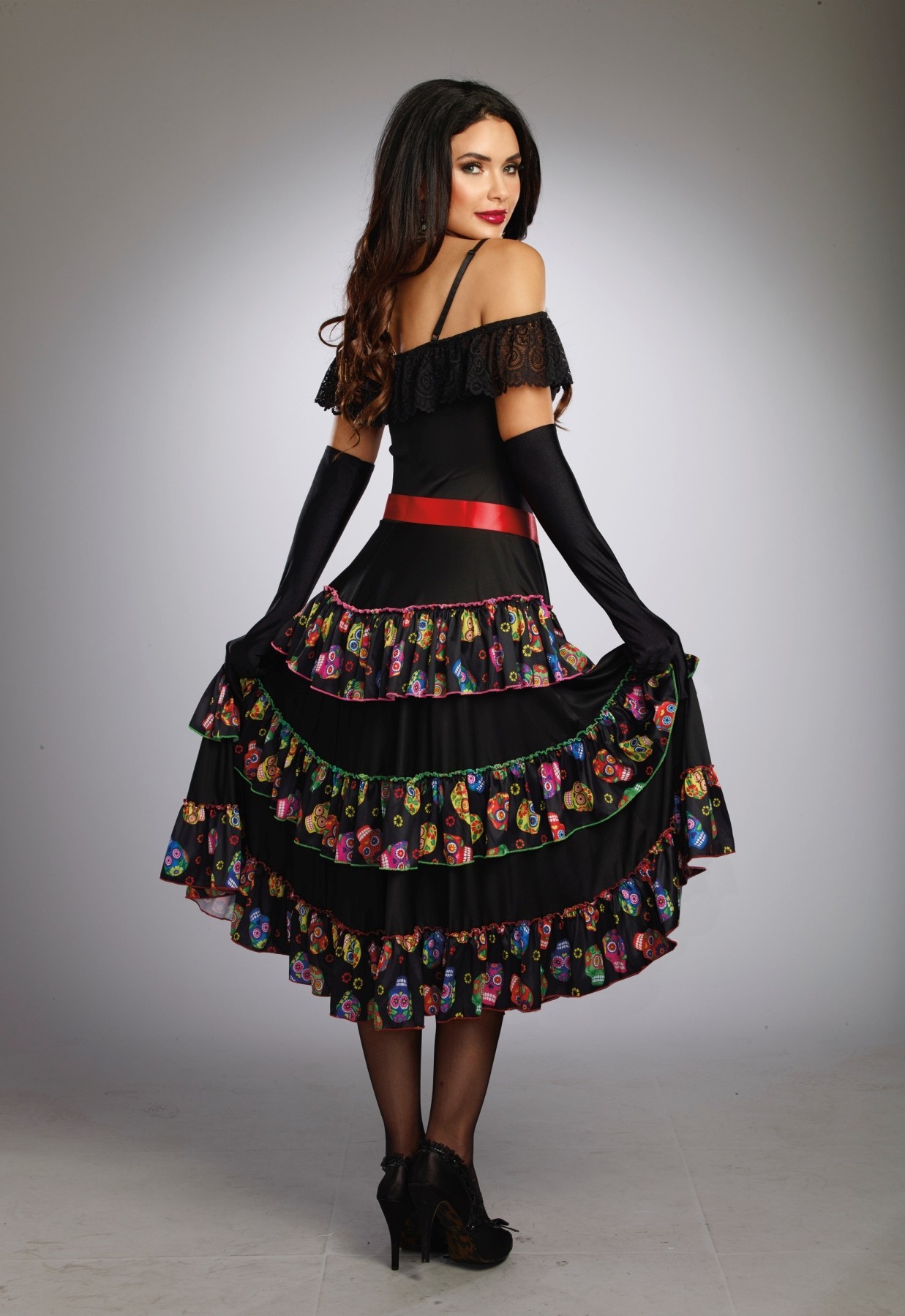 Ova crna duga haljina na volane dodatno je ukrašena šarenim kostruskim glavama, crvenom satenskom vrpcom kao remenom te crnom čipkom koja pada preko ramena. Set uključuje i ogrlicu s križem. Veo, čarape i rukavice nisu uključeni.