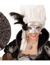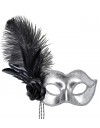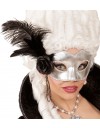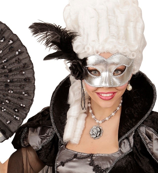 Maska je ukrašena s crnim perjem, ružom i biserima.