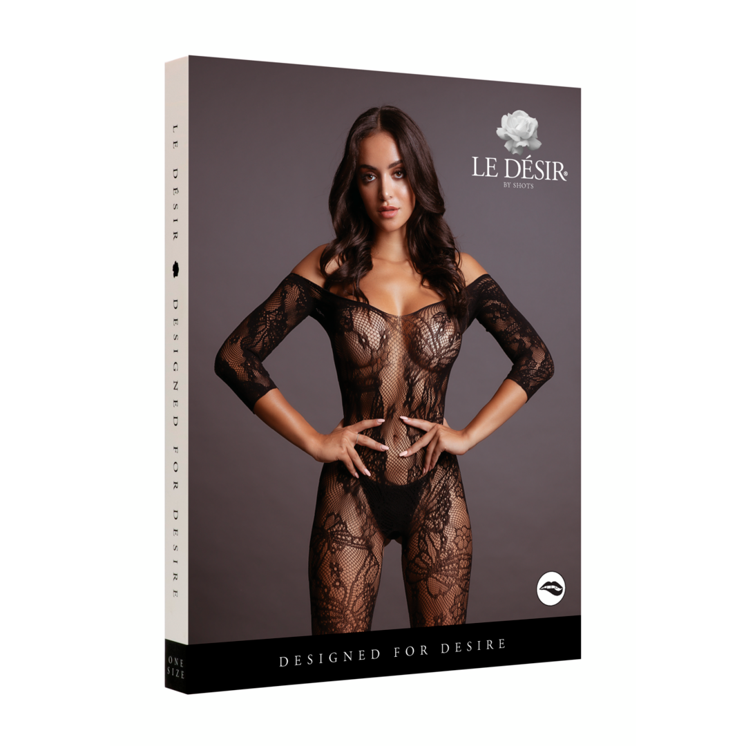 Crni bodystocking sa predivnom čipkom sa uzorkom leptira.
