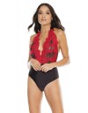 Body crne boje sa detaljima crvene čipke koji ukrašavaju dekolte dubokog V-izreza. Kopča se sa zadnje strane, a crnom elegantom vrpcom veže se oko vrata.