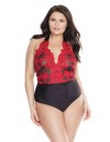 Body crne boje sa detaljima crvene čipke koji ukrašavaju dekolte dubokog V-izreza. Kopča se sa zadnje strane, a crnom elegantom vrpcom veže se oko vrata.