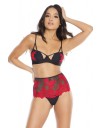 Izazovni komplet donjeg rublja crne boje te detaljima fine crvene čipke. Komplet uključuje grudnjak sa prorezima, te tangice visokog struka sa prozirnim detaljima.