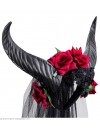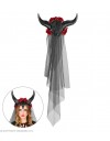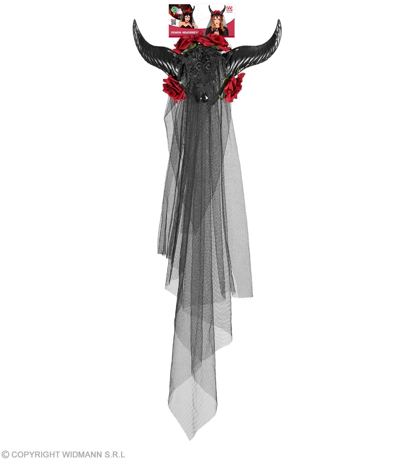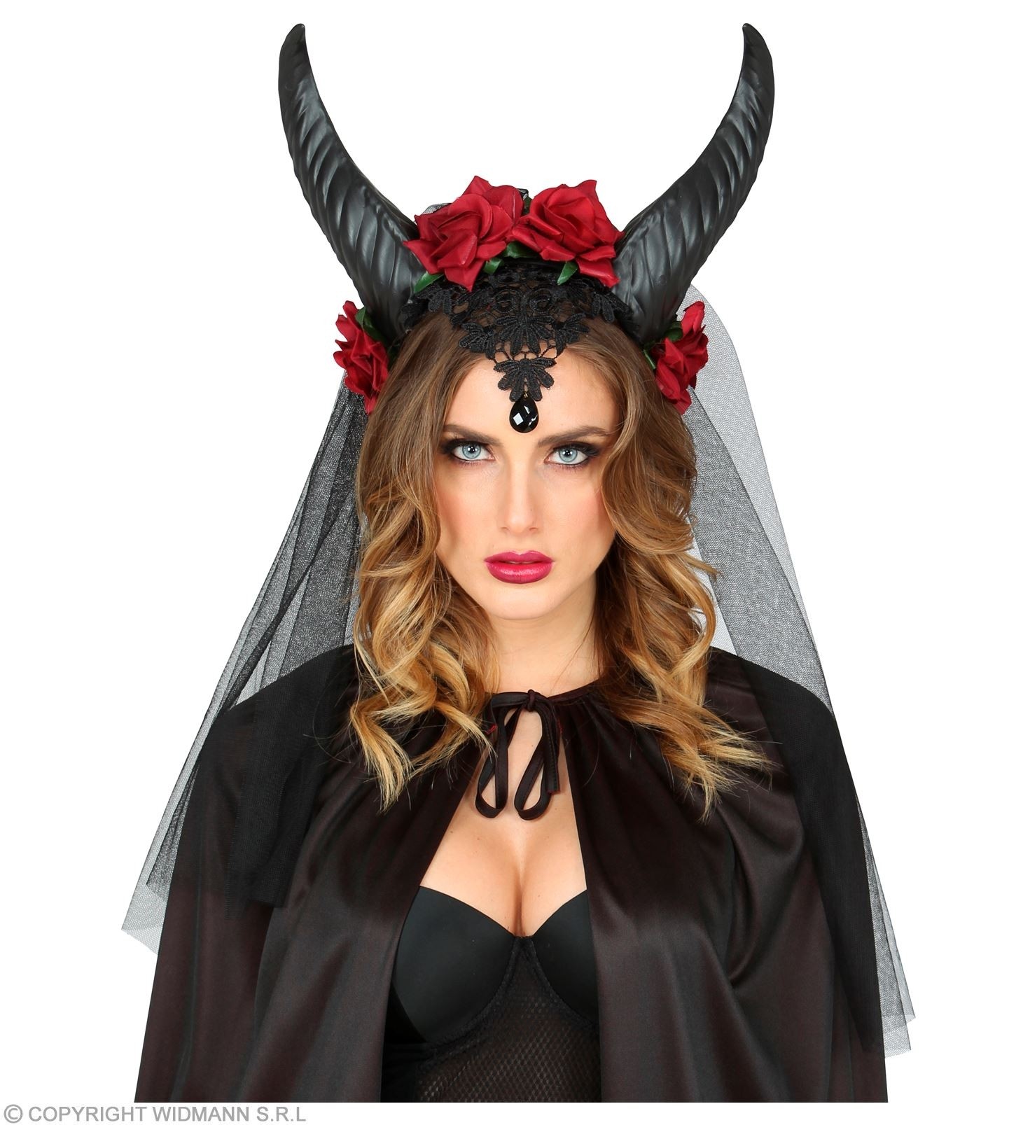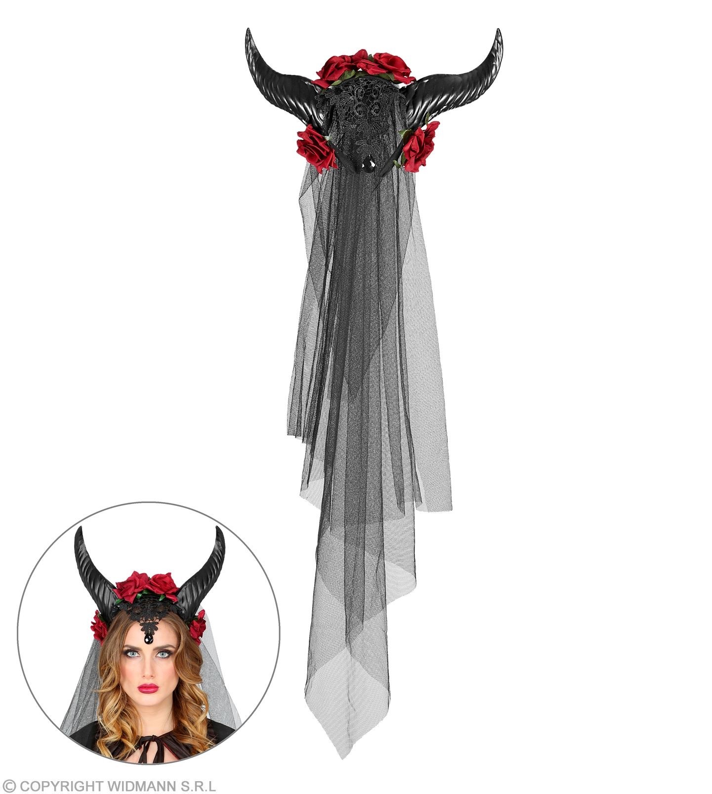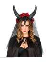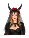 "BRIDAL VEIL WITH HORNS, ROSES, LACE AND BLACK GEM"